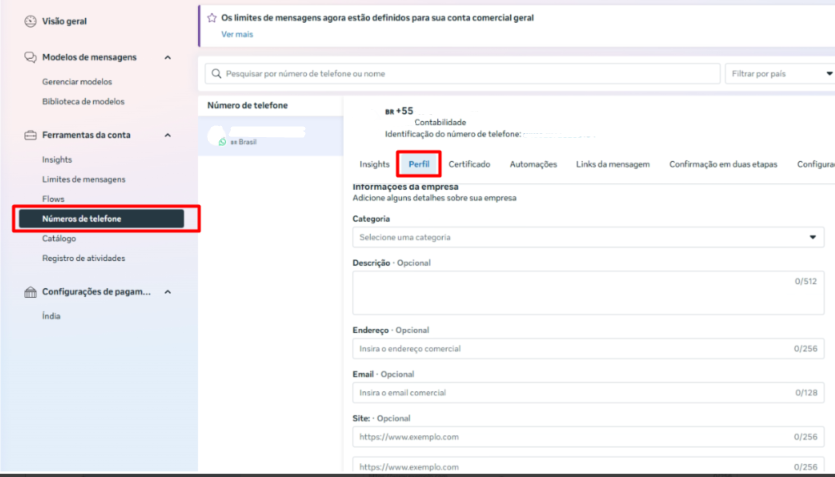 5. Na opção Número de Telefone, selecione a aba Perfil;