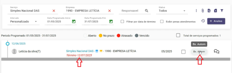 Ao atualizar a tela de Serviços Programados, é possível visualizar o serviço com status Bx. Automática e a data de término da atividade.