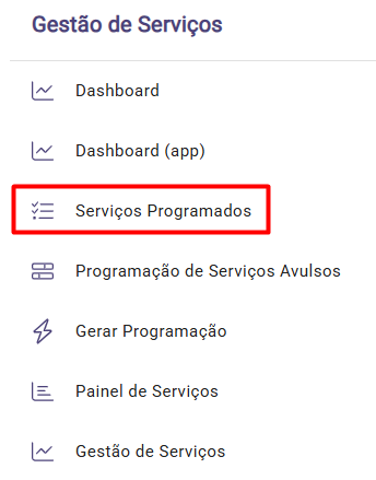 Acesse a solução Gestão de Serviços. No menu lateral esquerdo, clique em Serviços Programados.