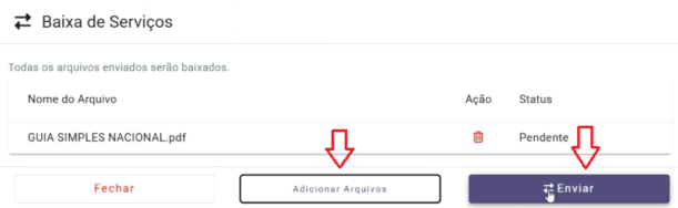 Ao acessar o ícone do clips, será exibida a tela para anexar o arquivo correspondente ao serviço a ser baixado. Clique em Adicionar Arquivos e, em seguida, em Enviar. Após o envio do arquivo, basta aguardar para que o usuário possa visualizar a baixa do serviço.