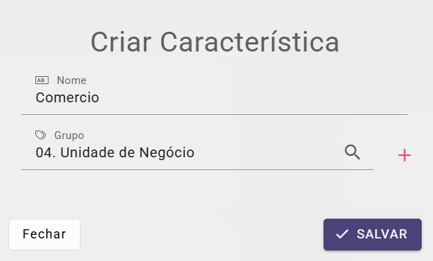Na aba características, clique em + Nova, informe o nome da característica, selecione o grupo ao qual ela pertence e, por fim, clique em Salvar.