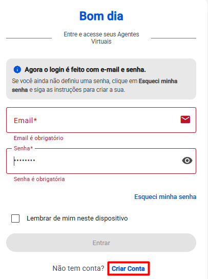 Em seguida, será exibida a tela de login. Nesta tela será será exibido os campos: E-mail, Senha, Opção (lembrar de mim neste dispositivo), Entrar e Criar conta.