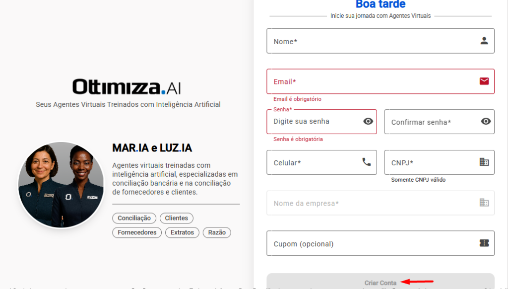 - Forneça as informações solicitadas pelo sistema: nome, e-mail, senha, número de celular e CNPJ;