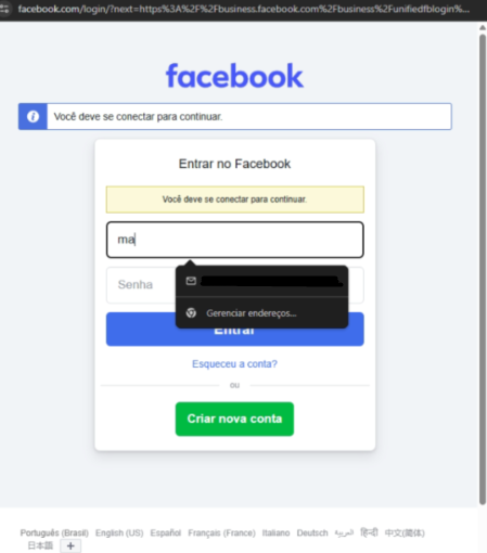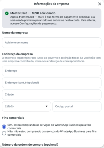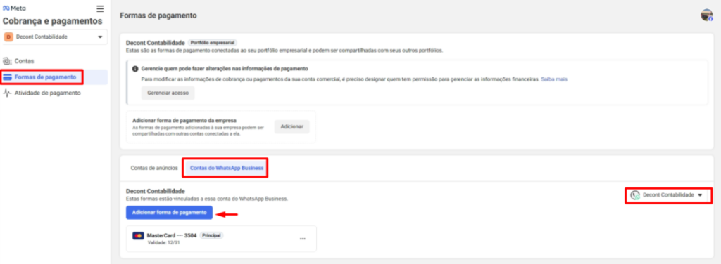 5. Na aba Formas de Pagamento, selecione Contas do WhatsApp Business. No campo à direita, confirme se a conta correta do WhatsApp está selecionada. Após essa verificação, clique em Adicionar Forma de Pagamento.