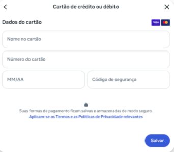 7. Adicione os dados de pagamento e selecione a opção Salvar.
