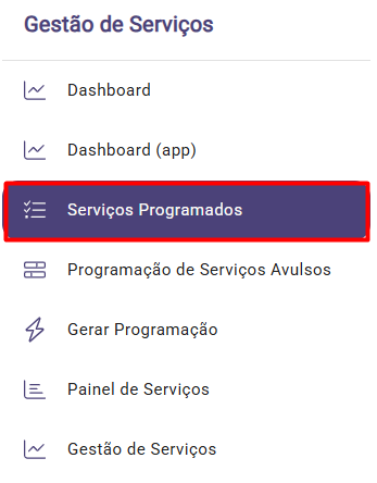 Ao acessar a solução Gestão de Serviços, o usuário será direcionado para a tela de Serviços Programados. Caso esteja em outra tela, no menu lateral esquerdo, clique em Serviços Programados.