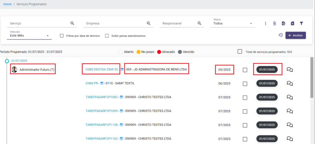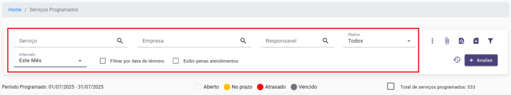 O usuário pode utilizar os filtros disponíveis para refinar a visualização, sendo eles: Serviço, Empresa, Responsável, Status e Intervalo de Datas.