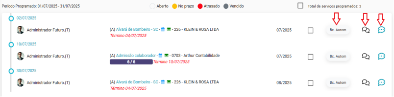 Após a finalização de uma atividade, seu status será alterado conforme o tipo de baixa realizado. Os ícones de Comentários do Serviço permitem a inclusão de informações complementares relacionadas à atividade. O ícone do balão azul dá acesso à comunicação vinculada ao serviço, conforme ilustrado na imagem a seguir.