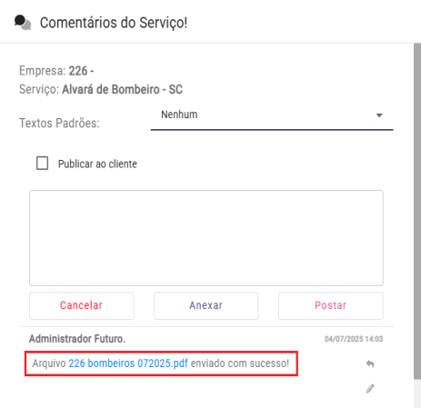 Por meio do ícone Comentário do Serviço, é possível visualizar o arquivo baixado automaticamente, que permanece salvo nesta tela para fácil acesso, conforme demonstrado na imagem a seguir.